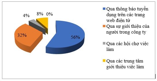 Qua khảo sát người lao động làm việc trong Công ty (thời gian khảo sát từ tháng 7 tới tháng 8/2024), trong đó 200 nhân viên mới, thì họ biết đến thông tin tuyển dụng qua các website, mạng xã hội (facebook, fanpage …) là 56%; qua giới thiệu của nhân viên đã làm ở Công ty là 32%. Đây là 2 nguồn chính để thu hút nhân lực về cho Công ty. Ngoài ra công ty còn tuyển nhân lực thông qua hội chợ việc làm là 4%, qua trung tâm giới thiệu việc làm và các kênh khác là không đáng kể (Hình).