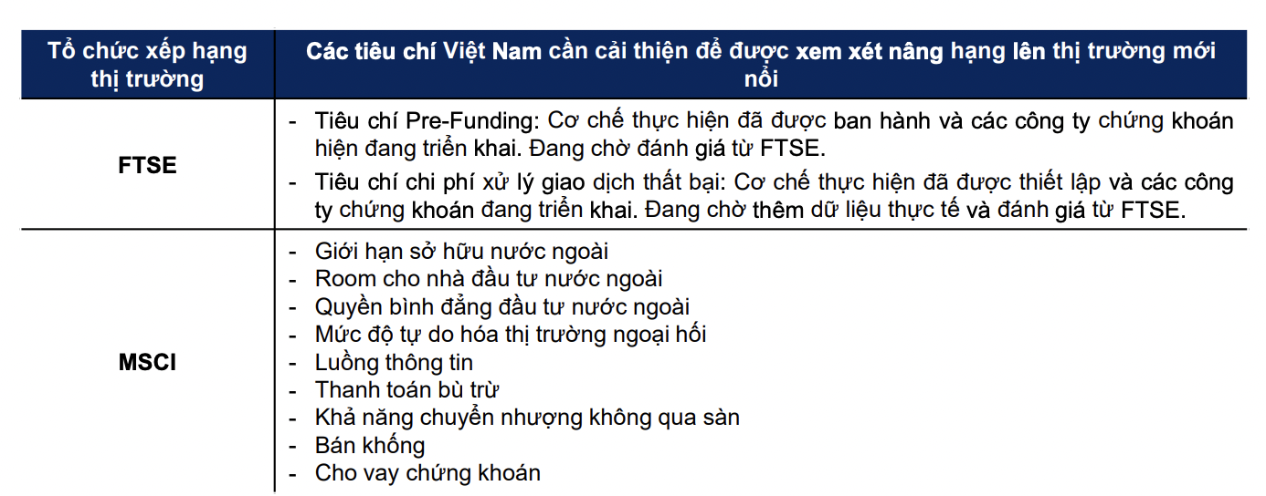 Với cam kết mạnh mẽ trong việc đạt được mục tiêu nâng hạng thị trường chứng khoán và xây dựng một thị trường vốn phát triển bền vững, các tiêu chí nâng hạng còn lại của MSCI sẽ được đáp ứng vào năm 2026, và thị trường Việt Nam nhiều khả năng sẽ chính thức được MSCI nâng hạng lên thị trường mới nổi Nguồn trong kỳ đánh giá tháng 6/2027.