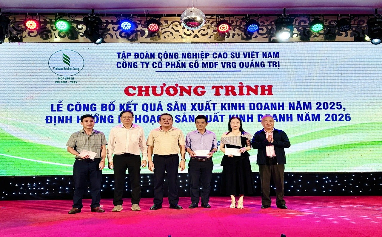 Công ty CP Gỗ MDF VRG Quảng Trị đã tổ chức chương trình biểu dương các đơn vị trực thuộc hoàn thành kế hoạch sản xuất năm 2025, vào ngày 24/12/2025.