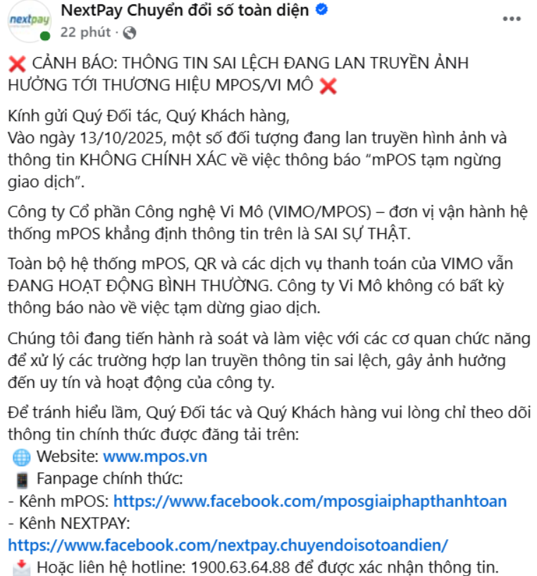 Công ty CP Công nghệ Vi Mô (thuộc hệ sinh thái NextTech), đơn vị vận hành hệ thống mPOS, vừa gởi thông báo đến đối tác, khách hàng để thông tin về việc ngày 13-10, một số đối tượng lan truyền hình ảnh và thông tin “mPOS tạm ngừng giao dịch”.