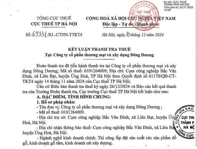 Cục Thuế Tp.Hà Nội vừa công khai kết luận thanh tra thuế đối với Công ty cổ phần Thương mại và xây dựng Đông Dương (Công ty xây dựng Đông Dương), địa chỉ Cụm công nghiệp Bắc Vân Đình, xã Liên Bạt, huyện Ứng Hoà, Tp.Hà Nội.