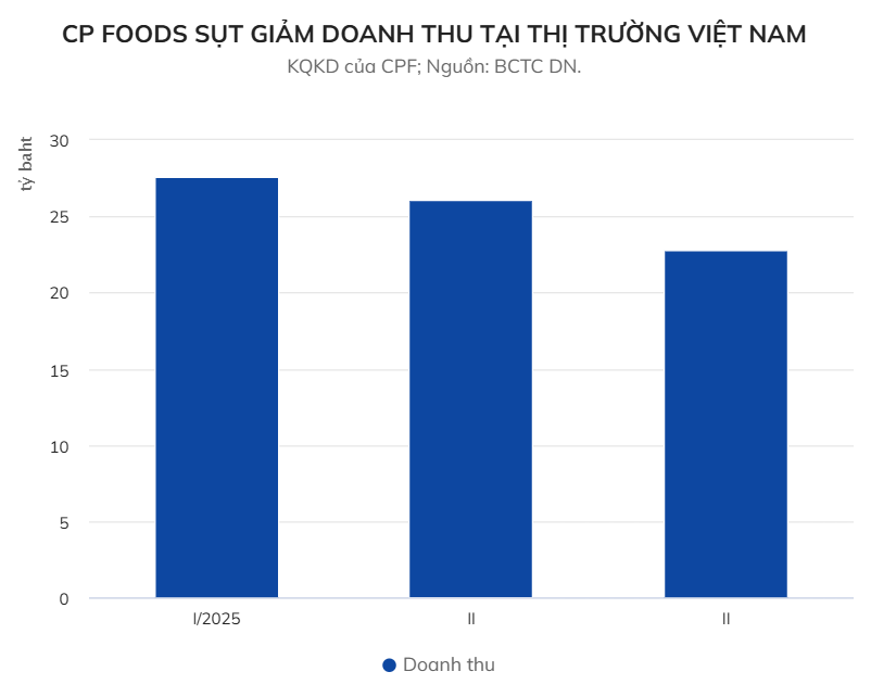 Tại Việt Nam, mảng chăn nuôi vẫn là trụ cột khi mang về 51,1 tỷ baht (1,58 tỷ USD) nhưng đã giảm 18% so với cùng kỳ. Mảng thức ăn chăn nuôi đạt 19,4 tỷ baht (600 triệu USD), giảm 18%; còn mảng thực phẩm ghi nhận 6,1 tỷ baht (190 triệu USD), giảm 3%.