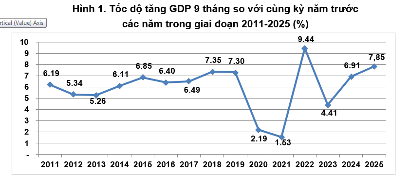 GDP chín tháng năm 2025 ước tăng 7,85% so với cùng kỳ năm trước, chỉ thấp hơn tốc độ tăng 9,44% của cùng kỳ năm 2022 trong giai đoạn 2011-2025.