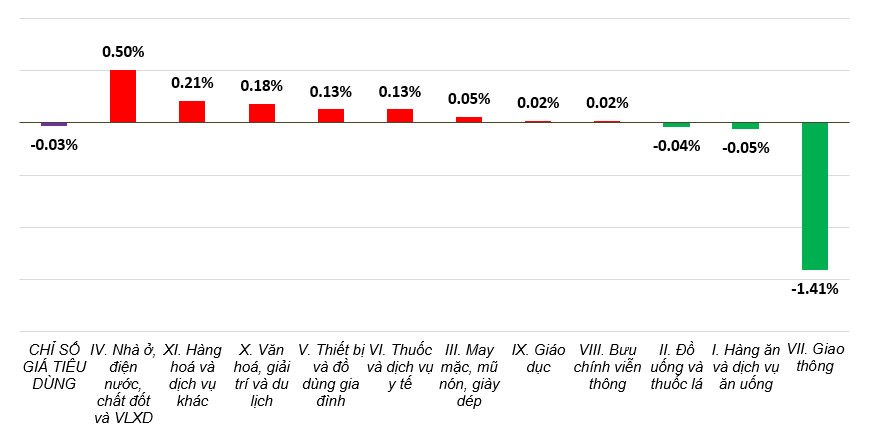 - Chỉ số nhóm giao thông giảm 2,4% (góp phần làm CPI chung giảm 0,23 điểm phần trăm), trong đó giá xăng dầu giảm 9,73%; dịch vụ vận tải hành khách bằng đường sắt giảm 6,06%.