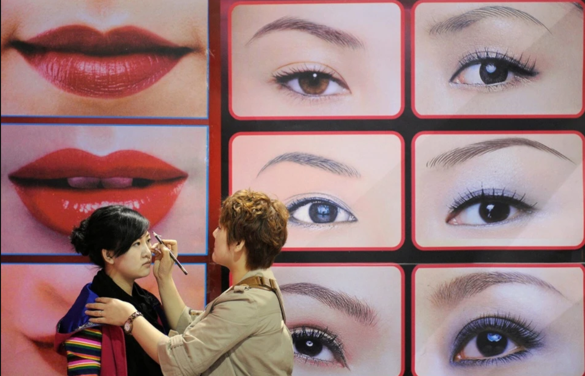 Chuyên viên trang điểm cho người mẫu tại một hội chợ làm đẹp ở tỉnh Sơn Tây, Trung Quốc ngày 6/4/2009. Ảnh: Reuters.