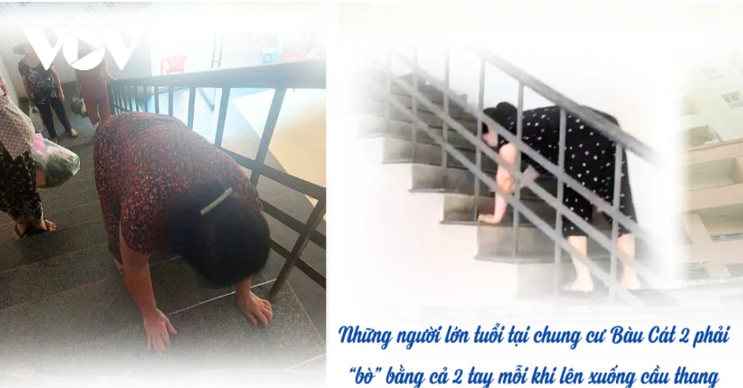 Nhiều năm nay, cư dân lô B chung cư Bàu Cát 2 phải leo bộ, thậm chí những người già yếu, bệnh tật phải bò lết mỗi ngày vì thang máy hư hỏng không được sửa chữa.