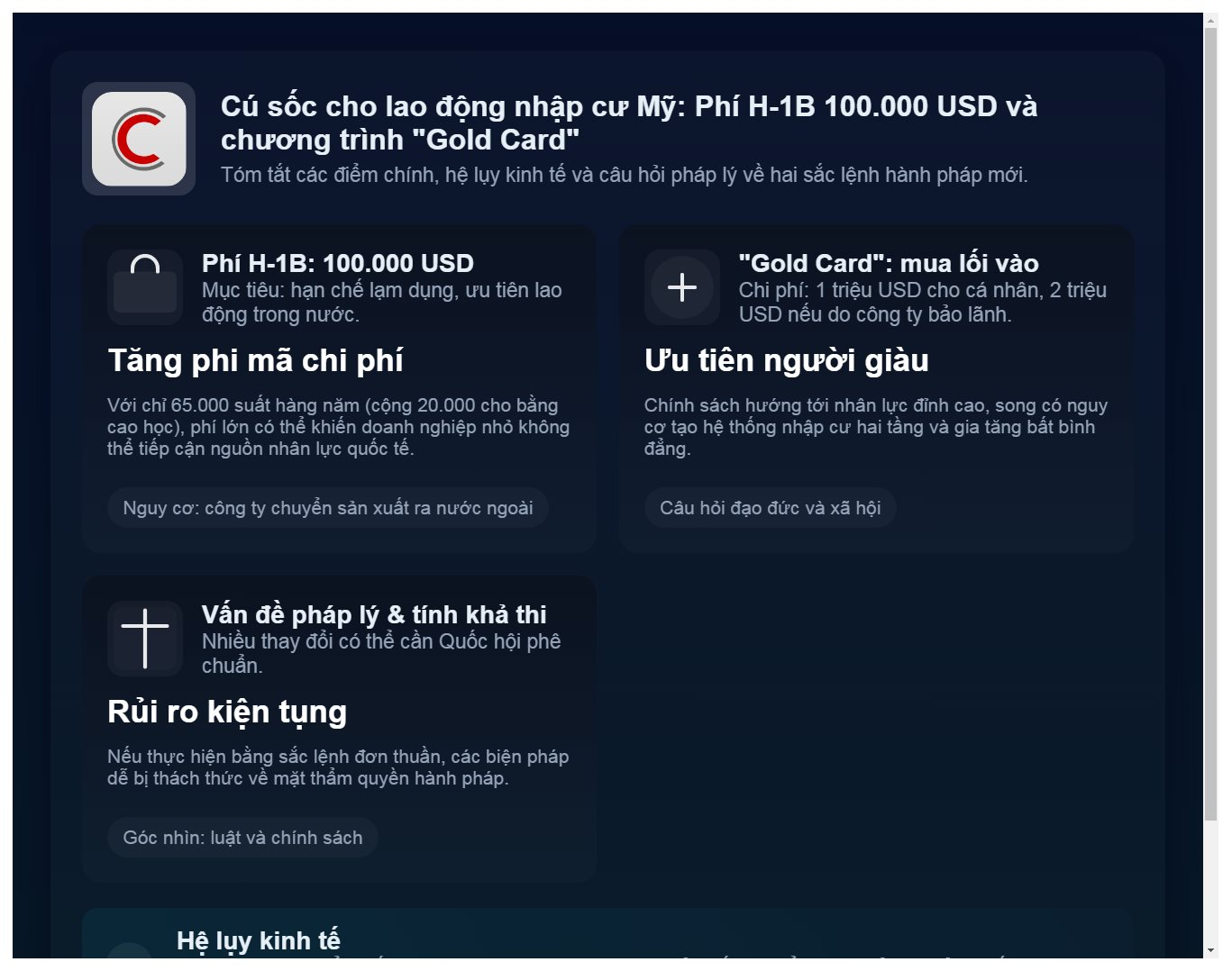 Một mặt là việc áp đặt mức phí 100.000 USD cho visa H-1B, mặt khác là sự ra đời của chương trình "thẻ vàng" với khoản phí hàng triệu USD. Những động thái này theo lời giải thích của Nhà Trắng là nhằm ưu tiên người lao động Mỹ và thu hút nhân tài cao cấp, nhưng chúng cũng đặt ra nhiều câu hỏi về tính hiệu quả và tác động lâu dài.