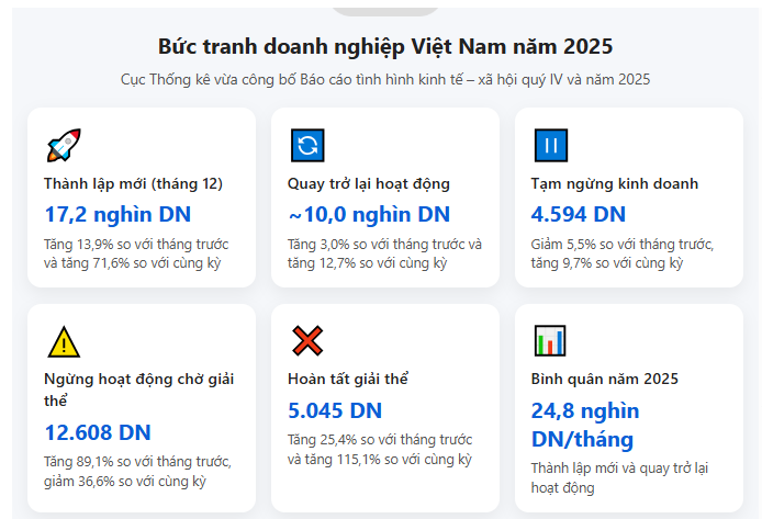 Cục Thống kê cũng ghi nhận số doanh nghiệp thành lập mới và quay trở lại hoạt động trong tháng 12/2025 tăng mạnh so với cùng kì năm trước.