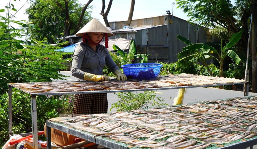Chị Trình Thị Như Hoa ở ấp 3, xã Thường Phước, khởi nghiệp với mô hình sản xuất khô cá đồng các loại. Ảnh: Nhựt An - TTXVN