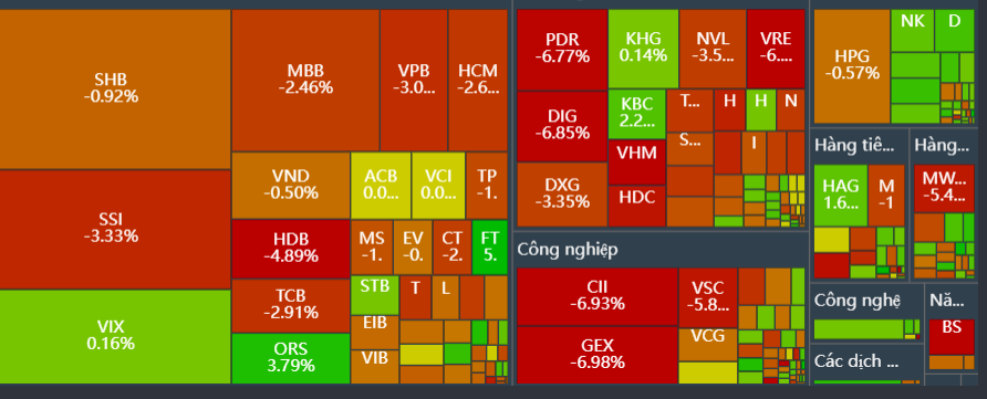 Nhóm cổ phiếu bất động sản và ngân hàng chịu tác động nặng nề nhất, kéo thị trường đi xuống. VHM (Vinhomes) giảm kịch sàn -6,99%, VRE (Vincom Retail) cũng sàn -6,99%, DXG (Đất Xanh) mất -5,38%. CEO (Tập đoàn CEO) lao dốc mạnh -9,74%, PDR (Phát triển Bất động sản Phát Đạt) giảm -6,77%. Ngân hàng cũng đỏ lửa: HDB (HDBank) -4,89%, TCB (Techcombank) -2,91%, MBB (MBBank) -2,46%, VPB (VPBank) -3,08%. SSI (Chứng khoán SSI) giảm -3,33%, VIC (Vingroup) -2,28%, MWG (Thế Giới Di Động) -5,48%. Những mã lớn này chiếm tỷ trọng cao trong rổ VN30, góp phần đẩy chỉ số mất mốc 1.680 điểm.