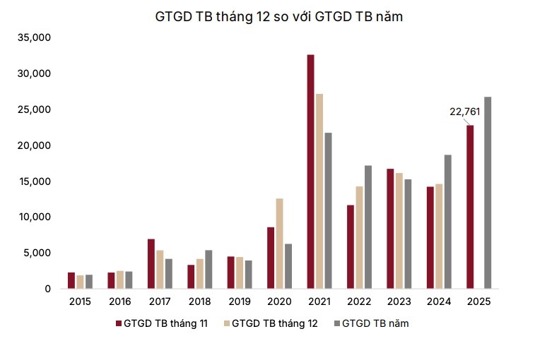 Tính từ đầu năm, VN-Index tăng khoảng 33%, nhưng nếu loại trừ ảnh hưởng từ nhóm Vingroup, mức tăng chỉ còn 13%, phản ánh sự phân hóa mạnh giữa các nhóm ngành cũng như sức kéo đáng kể của một số cổ phiếu trụ. Thanh khoản trong tháng 11 giảm mạnh khi giá trị khớp lệnh bình quân trên HoSE chỉ còn 20.000 tỷ đồng mỗi phiên, thấp hơn 35,5% so với tháng 10.