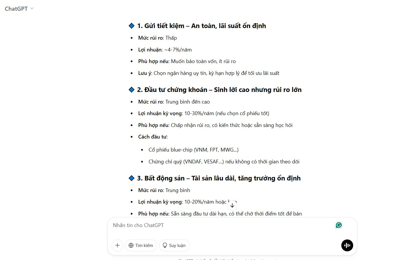 ChatGPT trả lời: Có 1 tỷ đồng, bạn có nhiều lựa chọn đầu tư tùy vào mục tiêu tài chính, mức độ chấp nhận rủi ro và thời gian mong muốn sinh lời. Dưới đây là một số gợi ý: