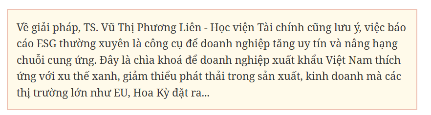 Mặc dù là thách thức lớn, song bà Thanh Tâm cũng cho rằng, có nhiều giải pháp cho doanh nghiệp Việt Nam. Theo đó, bà Thanh Tâm khuyến nghị, doanh nghiệp cần chuyển dịch hướng tư duy từ phòng thủ sang vận động để thích ứng. Việc thực hành tiêu chuẩn ESG (môi trường - xã hội - quản trị) không nên chỉ xem là chi phí tuân thủ, mà hãy nên coi đó là một động lực để tạo ra giá trị, tạo ra tăng trưởng.