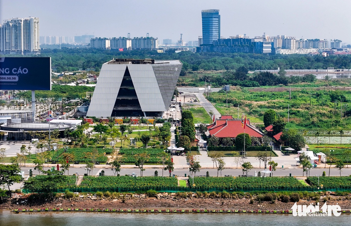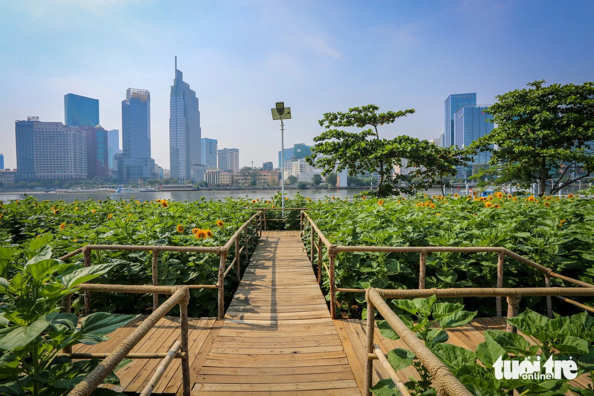 Tết 2024, bờ sông Sài Gòn phía Thủ Thiêm đã tươm tất hơn nhưng vẫn còn đơn giản. Điểm nhấn lớn nhất lúc bấy giờ là vườn hoa hướng dương. Một năm qua, nơi này tiếp tục được đầu tư xây dựng thêm nhiều hạng mục.