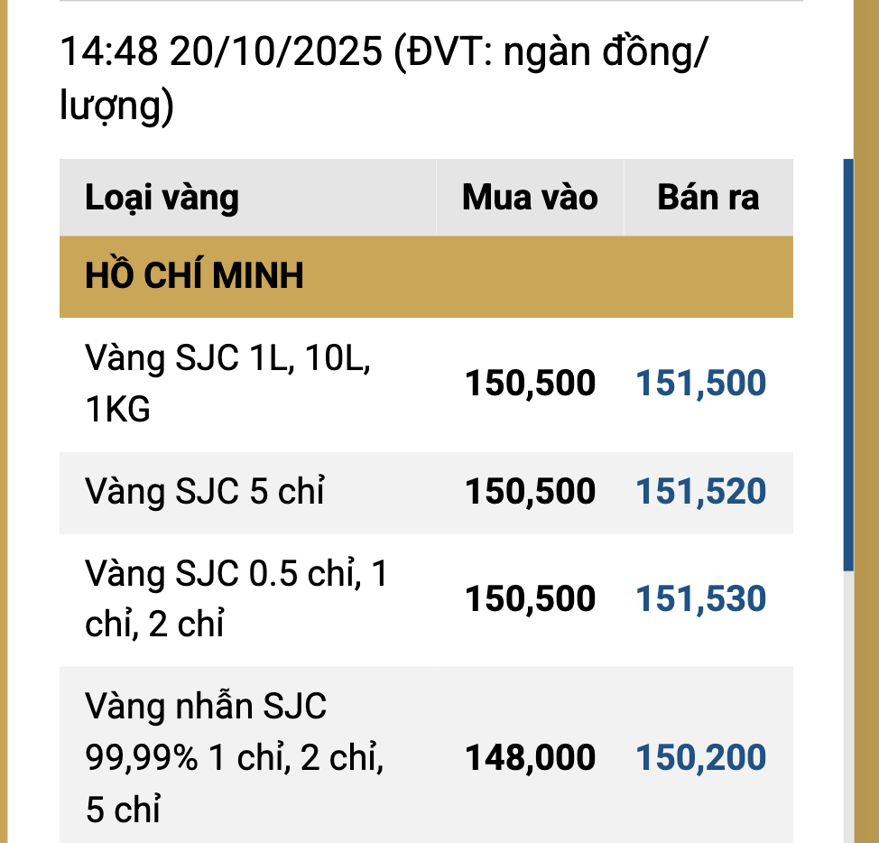 Cuối ngày 20-10, Công ty vàng bạc đá quý Sài Gòn (SJC) niêm yết giá vàng miếng SJC mua vào 150,5 triệu đồng/lượng, bán ra 151,5 triệu đồng/lượng, tăng 500.000 đồng mỗi lượng so với buổi sáng.