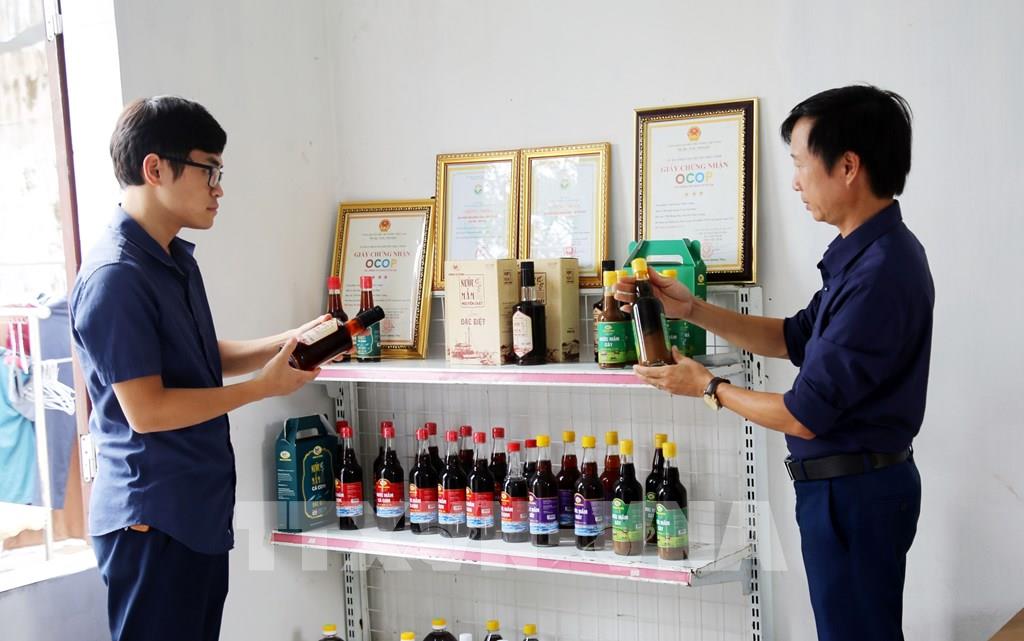 Giới thiệu các sản phẩm OCOP nước mắm và mắm cáy Ninh Cường (xã Ninh Cường, tỉnh Ninh Bình). Ảnh: Nguyễn Lành - TTXVN