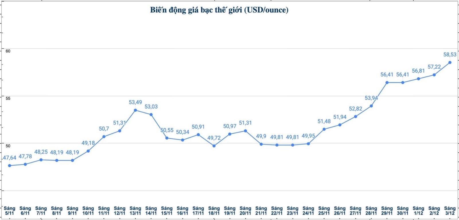 Thị trường kim loại quý vừa chứng kiến một cột mốc đáng chú ý: Giá hợp đồng tương lai bạc đã vọt lên mức cao nhất mọi thời đại. Giá bạc giao tháng 3 tăng 0,597 USD lên 57,77 USD/ounce sau khi đạt mức cao kỷ lục 58,61 USD/ounce.