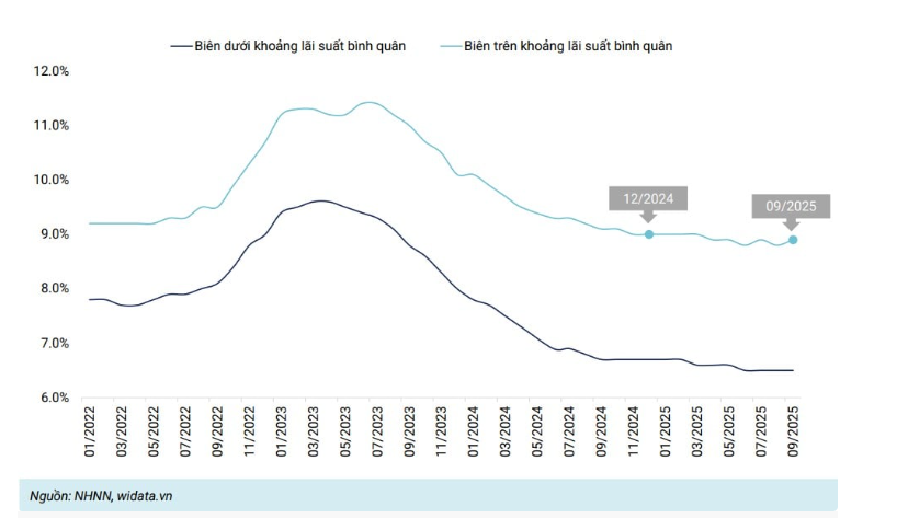 Từ mức 6,7% - 9% vào cuối năm 2024, lãi suất cho vay đã lùi về 6,5% - 8,9%, đánh dấu mức thấp nhất trong ba năm trở lại đây. Mặt bằng lãi suất cho vay thấp cũng là một trong những động lực thúc đẩy tăng trưởng tín dụng của toàn ngành. Tính trong 9 tháng năm 2025, hoạt động tín dụng của ngành ngân hàng tiếp tục tăng trưởng tích cực với quy mô dư nợ đạt 13,626.55 nghìn tỷ đồng, tăng 15% so với đầu năm và 22% so với cùng kỳ năm ngoái, báo cáo của WiGroup chỉ ra.
