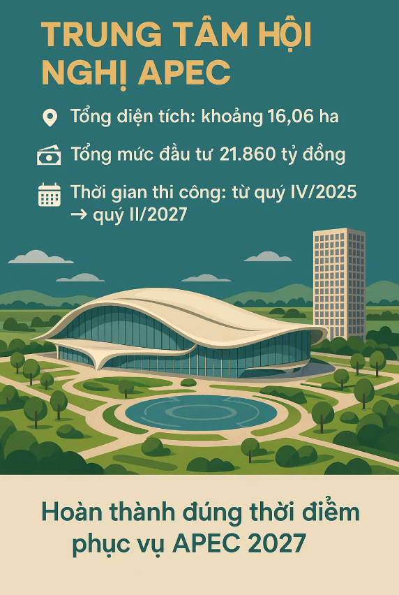 Dự án dự kiến triển khai từ quý IV/2025 đến quý II/2027, kịp thời phục vụ APEC 2027. Sau khi nghiệm thu, địa phương sẽ tiến hành thanh toán cho nhà đầu tư thông qua việc bàn giao quỹ đất đối ứng và quyết toán theo hợp đồng Xây dựng – Chuyển giao (BT), hình thức nằm trong khung pháp lý PPP.
