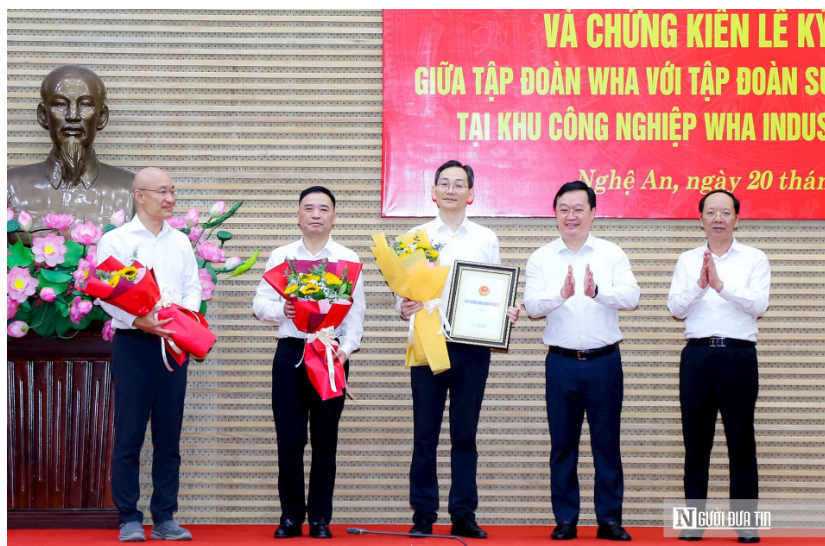 Lãnh đạo tỉnh Nghệ An trao giấy chứng nhận đăng ký đầu tư Dự án đầu tư cơ sở mới Sunny Automotive Quang học Vina cho Tập đoàn Sunny tại KCN WHA 1 - Nghệ An.