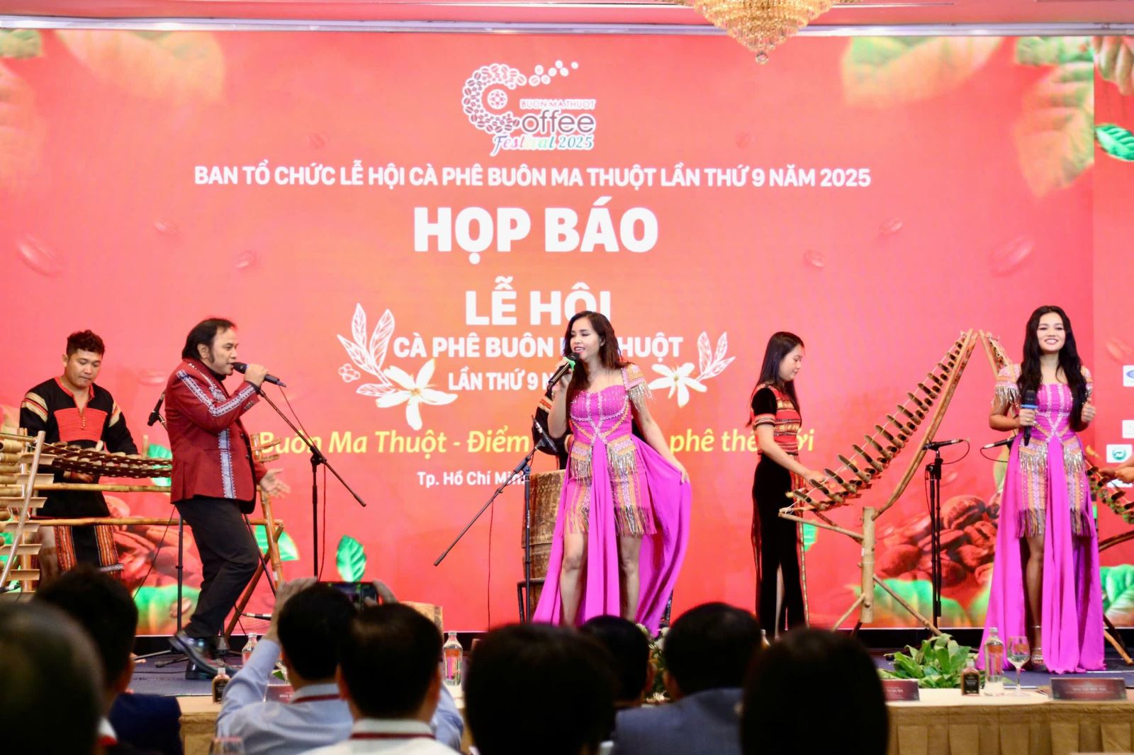 Các tiết mục văn nghệ mang bản sắc Tây Nguyên tại họp báo thông tin lễ hội cà phê Buôn Ma Thuột.