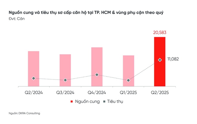 Báo cáo của DKRA Consulting cũng cập nhật diễn biến của phân khúc căn hộ trong quý 2/2025. Theo đó, khác với đất nền, nguồn cung căn hộ sơ cấp phía Nam đạt hơn 2.000 căn, tăng 40% so với cùng kì năm 2024. Bình Dương (cũ) và Tp. HCM (cũ) tiếp tục là địa phương dẫn đầu về phân khúc căn hộ khi chiếm 79,6% tổng nguồn cung sơ cấp toàn thị trường.