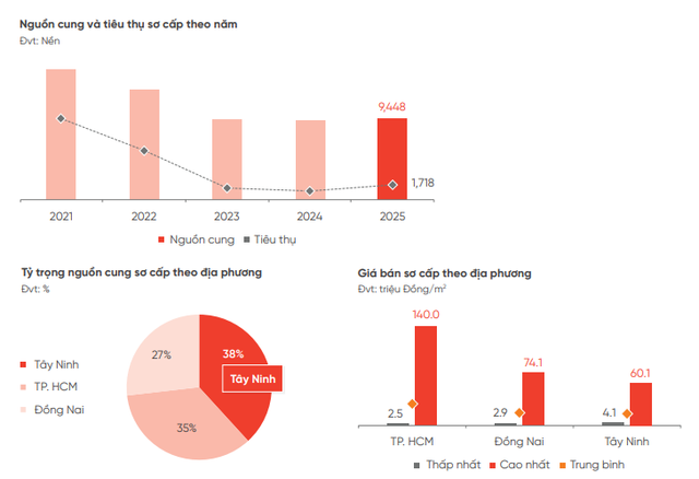 Tây Ninh giữ vai trò dẫn dắt nguồn cung mới khi tỷ trọng nguồn cung và lượng tiêu thụ đạt lần lượt là 38% và 53%. So với cùng kỳ năm 2024, mặt bằng giá sơ cấp đạt mức tăng trung bình 6% và mặt bằng giá thứ cấp đạt mức tăng phổ biến 12 - 15%.
