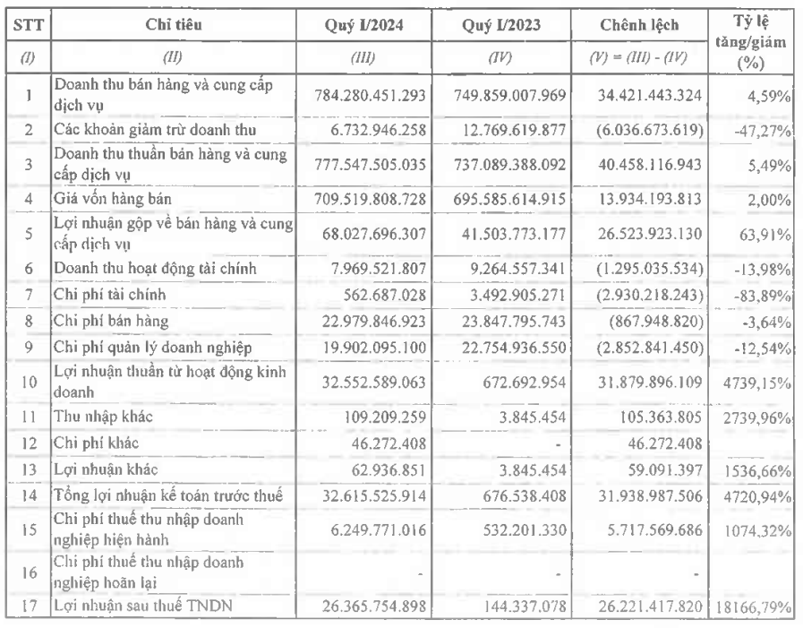 Mặc dù, doanh thu chỉ tăng 5,5% so với cùng kỳ nhưng lợi nhuận sau thuế tăng hơn 18 lần, tương ứng đạt 26,37 tỷ nhờ biên lợi nhuận tăng từ 5,6% lên 8,7% và các chi phí hoạt động đều được tiết giảm.