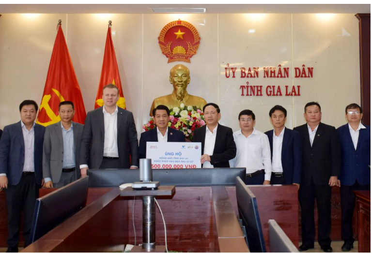 Tập đoàn De Heus và Tập đoàn Hùng Nhơn đã trao tặng 500 triệu đồng hỗ trợ người dân Gia Lai khắc phục hậu quả sau bão lũ. Ảnh: Cổng TTĐT Gia Lai