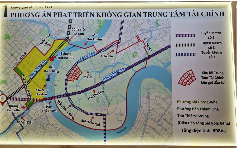 Theo công bố, không gian IFC tại TP.HCM có diện tích khoảng 899 ha trải rộng tại phường Bến Thành, phường Sài Gòn, khu vực Thủ Thiêm và 64 ha khu vực sông Sài Gòn.