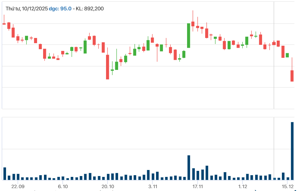 Bên cạnh đó, thanh khoản của cổ phiếu này cũng gia tăng đột biến. Kết phiên, có tới hơn 18,5 triệu cổ phiếu DGC được "sang tay", tương đương gần 4,8% tổng số cổ phần đang niêm yết. Con số này lập kỷ lục thanh khoản kể từ khi DGC lên sàn, đồng thời đưa DGC nằm trong top 8 những cổ phiếu được giao dịch nhiều nhất trong phiên 16/12.