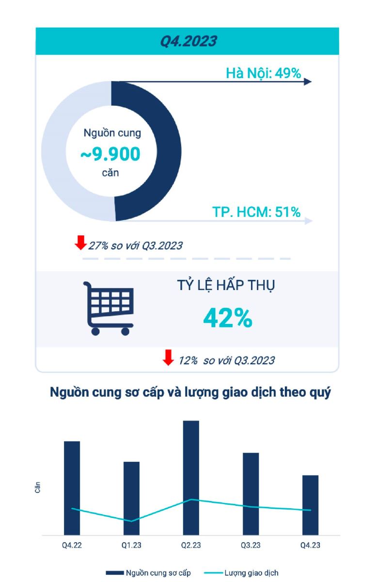Trong Q4.2023, khoảng 583 sản phẩm nghỉ dưỡng được đưa ra thị trường, tăng gần 53% so với Q3.2023 và giảm gần 79% so với cùng kỳ năm trước.