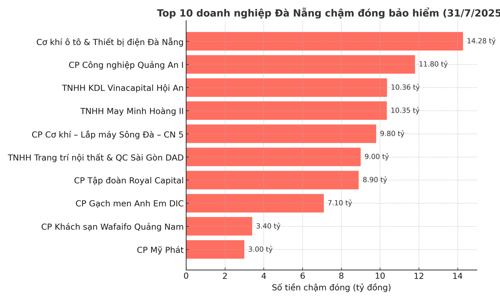 Theo thống kê của Bảo hiểm Xã hội Đà Nẵng, dẫn đầu danh sách nợ bảo hiểm là Công ty Cơ khí ô tô và Thiết bị điện Đà Nẵng với hơn 14,28 tỷ đồng, trong đó riêng tiền lãi chậm đóng gần 7,2 tỷ đồng. Xếp tiếp theo là Công ty CP Công nghiệp Quảng An I chậm đóng 11,8 tỷ đồng; Công ty TNHH Khu Du lịch Vinacapital Hội An chậm đóng 10,36 tỷ đồng; Công ty TNHH May Minh Hoàng II chậm đóng 10,35 tỷ đồng; Công ty CP Cơ khí – Lắp máy Sông Đà – Chi nhánh 5 gần 9,8 tỷ đồng.