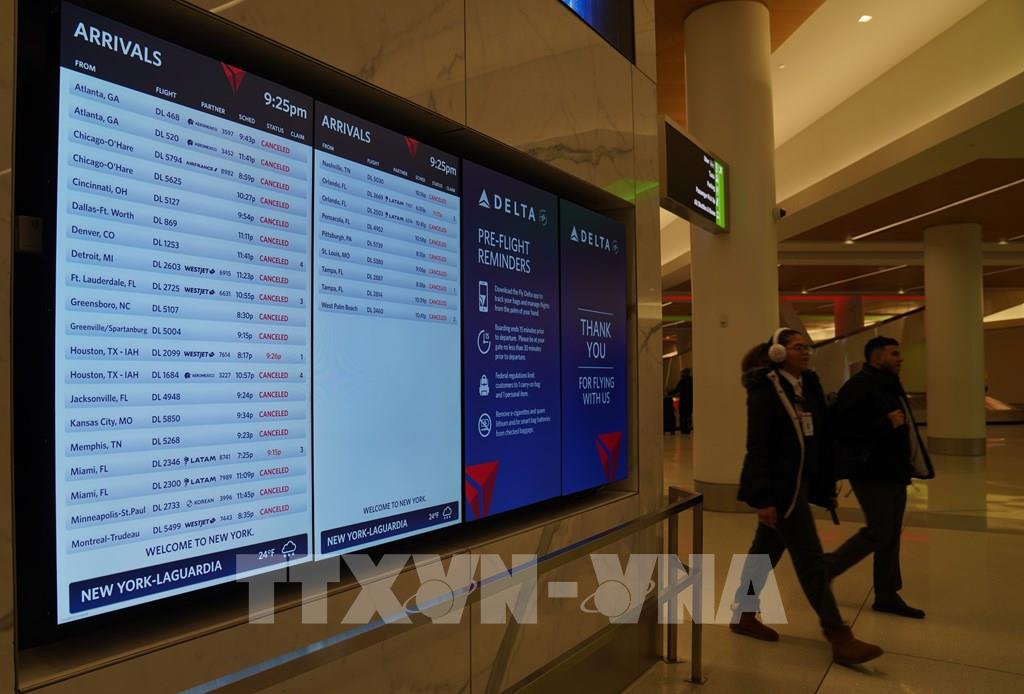 Bảng điện tử thông báo hàng loạt chuyến bay bị huỷ tại sân bay LaGuardia ở New York, Mỹ do bão tuyết, ngày 26/12/2025. Ảnh: THX/TTXVN