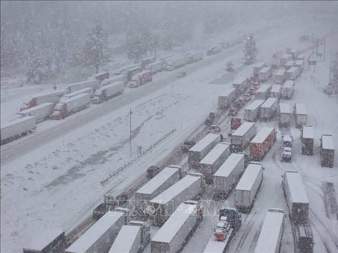Tuyết rơi dày đặc khiến giao thông ùn tắc tại California, Mỹ. Ảnh: AA/TTXVN