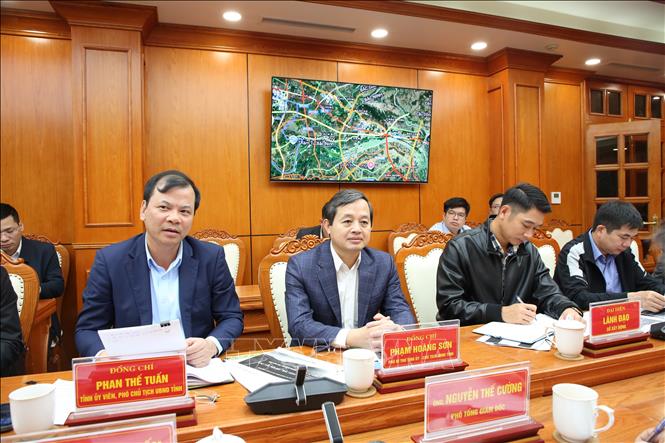 Chủ tịch UBND tỉnh Phạm Hoàng Sơn (thứ 2 từ trái qua) trao đổi tại buổi làm việc. Ảnh: Đỗ Huyền/TTXVN