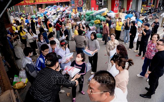 Các đội tình nguyện vận chuyển hàng hoá, nhu yếu phẩm lên xe để gửi đến người dân vùng thiên tai. Ảnh: Công Luật/TTXVN