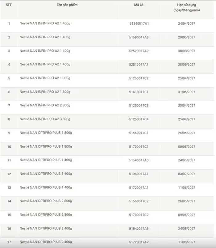 Các lô sữa thu hồi gồm: Nestlé NAN INFINIPRO A2 bước 1, trọng lượng 400 gram (4 lô); Nestlé NAN INFINIPRO A2 bước 1, trọng lượng 800 gram (4 lô); Nestlé NAN OPTIPRO PLUS bước 1, trọng lượng 800 gram (2 lô); Nestlé NAN OPTIPRO PLUS bước 1, trọng lượng 400 gram (3 lô); Nestlé NAN OPTIPRO PLUS bước 2, trọng lượng 800 gram (2 lô); Nestlé NAN OPTIPRO PLUS bước 2, trọng lượng 400 gram (2 lô), hạn sử dụng trong khoảng tháng 4 đến tháng 9-2027. Những loại sữa này dành cho nhóm trẻ từ sơ sinh đến 24 tháng tuổi.