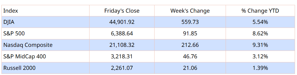 Thị trường chứng khoán Mỹ tiếp tục bứt phá trong tuần qua, đưa chỉ số S&P 500 và Nasdaq lên mức cao kỷ lục tuần thứ hai liên tiếp. Chỉ số Dow Jones tăng 1,26%, trong khi S&P MidCap 400 và Russell 2000 đều nhích hơn 0,9%. Nhóm cổ phiếu giá trị vượt trội so với nhóm tăng trưởng trong phần lớn thời gian của tuần, dù chênh lệch không lớn vào cuối phiên thứ Sáu.