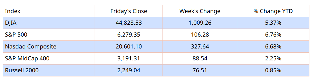 Các chỉ số chứng khoán chính của Mỹ khép lại tuần giao dịch rút ngắn vì kỳ nghỉ lễ với mức tăng tích cực. Các chỉ số vốn hóa vừa và nhỏ dẫn đầu đà tăng, khi chỉ số S&P MidCap 400 tăng 2,85% và Russell 2000 tăng 3,52%. Chỉ số Dow Jones Industrial Average cũng tăng 2,30%.