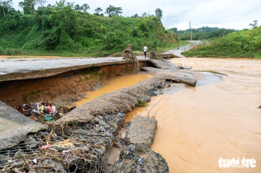 Cầu tràn vào thôn Cheng hư hỏng nghiêm trọng do mưa lũ - Ảnh: HOÀNG TÁO