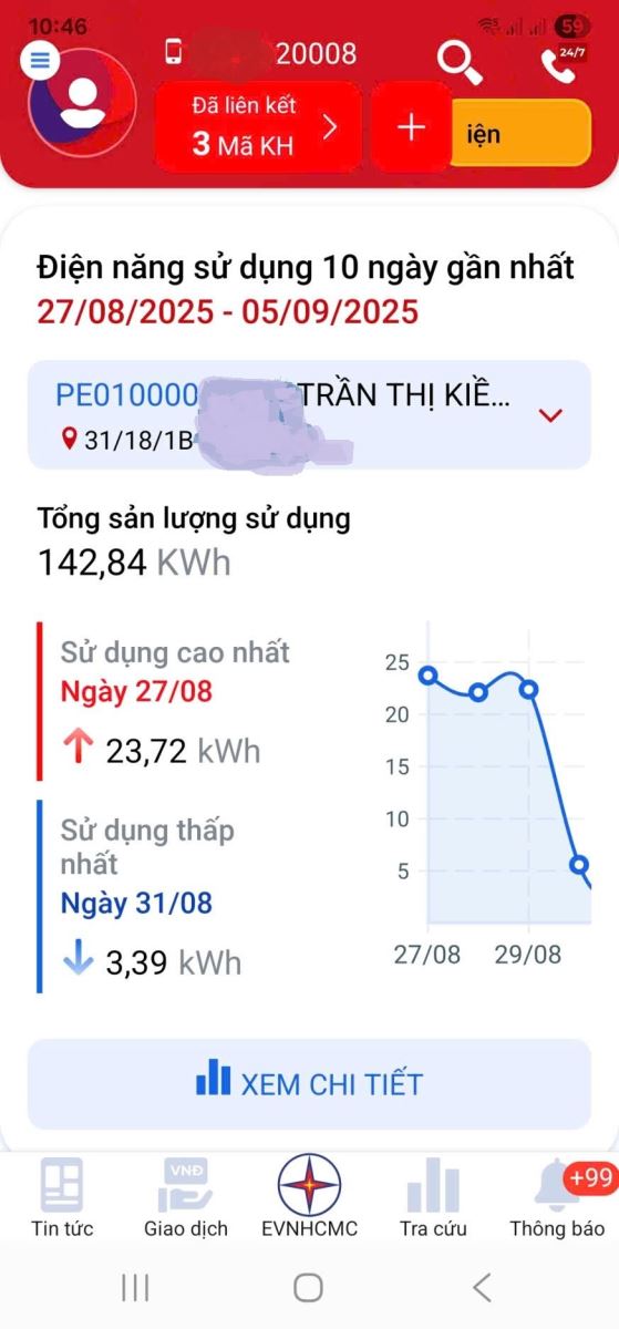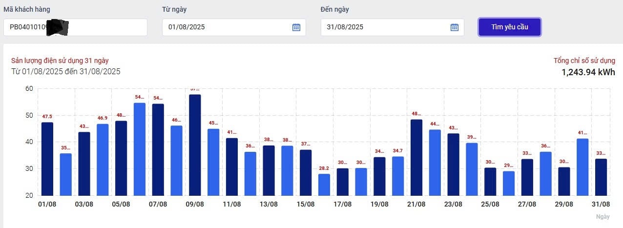 Truy cập vào App EVNHCMC, tất cả các khách hàng sẽ xem được biểu đồ điện năng tiêu thụ theo ngày - tháng - năm, qua đó giúp khách hàng biết được ngày sử dụng cao nhất, ngày sử dụng thấp nhất để có thể điều chỉnh hành vi sử dụng điện. Khi vào mục “Xem bảng chi tiết”, khách hàng sẽ xem rõ ràng chỉ số công tơ và lượng điện năng tiêu thụ theo ngày.