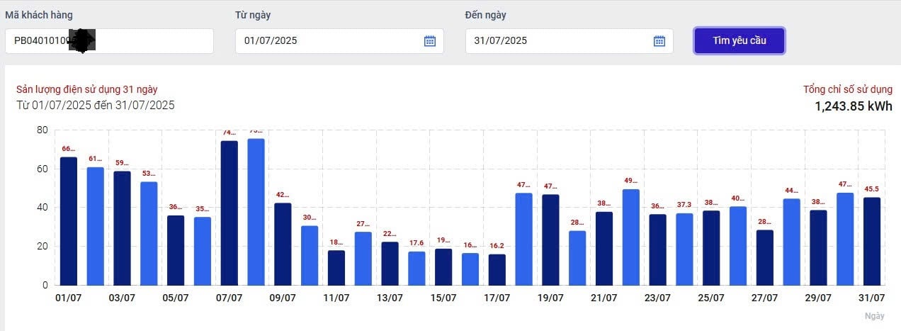 Lượng điện tiêu thụ các ngày trong tháng 7 của khách hàng phản ánh “giống hệt nhau” giữa tháng 7 và tháng 8. Ảnh: HH