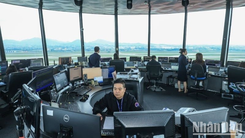 Kiểm soát viên không lưu làm việc trên Đài chỉ huy Nội Bài.