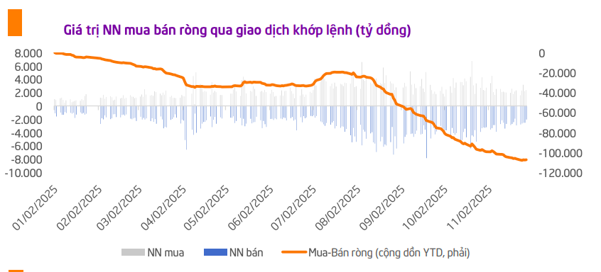 Dù vậy, khối ngoại tiếp tục là điểm trừ khi duy trì bán ròng tháng thứ 4 liên tiếp. Riêng tháng 11, khối ngoại bán ròng gần 8.000 tỷ đồng qua khớp lệnh, dù con số này đã giảm đáng kể so với hai tháng trước. Tính chung 11 tháng, tổng giá trị bán ròng đạt hơn 127.600 tỷ đồng, vượt xa mức kỷ lục năm 2024 và cho thấy dòng vốn ngoại vẫn chịu áp lực lớn từ biến động tỷ giá, lãi suất tăng và hoạt động tái cơ cấu danh mục của các quỹ cận biên trước kỳ nâng hạng. Tuy nhiên, TPS kỳ vọng, xu hướng này có thể đảo chiều khi các yếu tố bất lợi như tỷ giá suy giảm, chính sách lãi suất ổn định và thông tin nâng hạng trở nên rõ ràng hơn.
