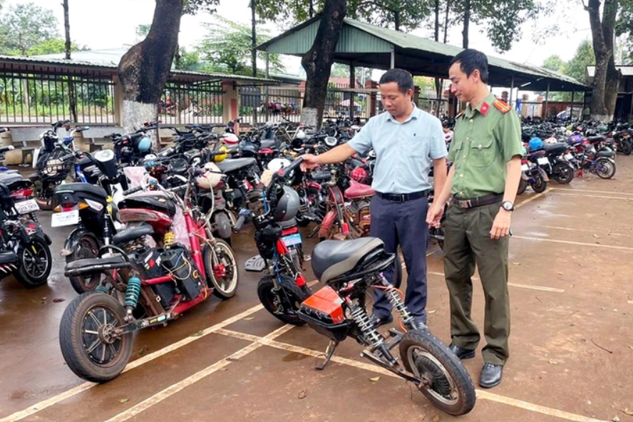 Lực lượng Công an xã Tân Hưng (tỉnh Đồng Nai) kiểm tra phát hiện nhiều xe đạp điện có dấu hiệu độ chế trong khuôn viên trường học ở địa bàn - Ảnh: Công an Đồng Nai