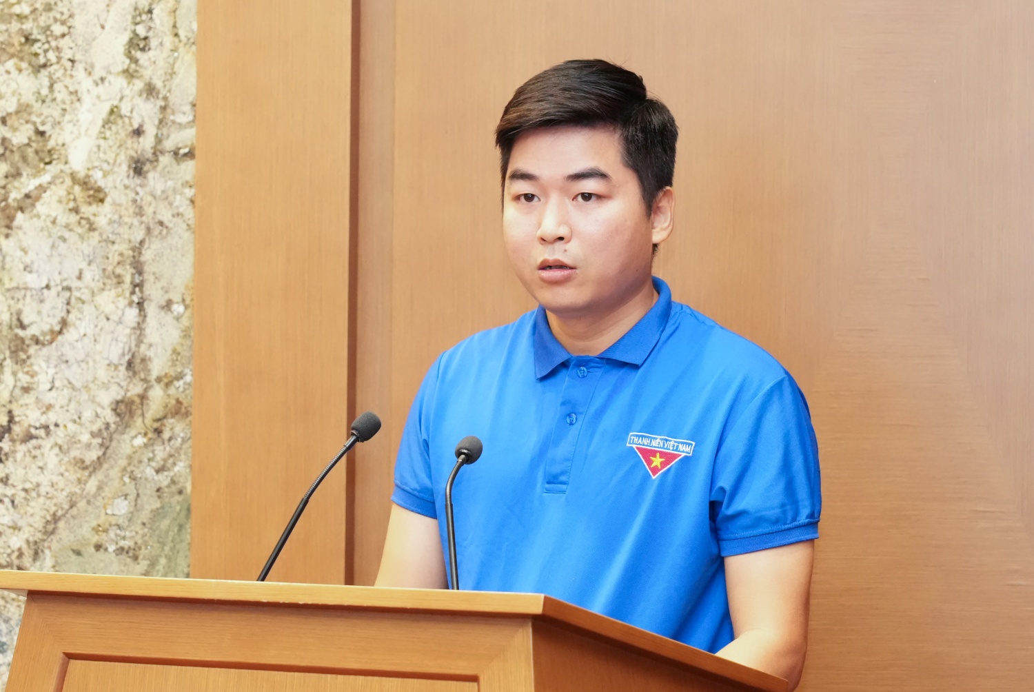 Đồng chí Phạm Hồng Sơn, Bí thư Đoàn Thanh niên BMQL&ĐH Petrovietnam báo cáo tại Hội nghị