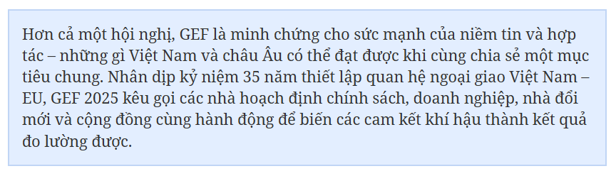 Là đơn vị đồng tổ chức GEF 2025, đại diện VIETRADE bày tỏ tin tưởng vào vai trò của diễn đàn trong việc thúc đẩy kết nối doanh nghiệp và cam kết mạnh mẽ thúc đẩy hợp tác giữa Việt Nam và châu Âu hướng tới tăng trưởng bền vững. Đồng thời, ông cũng khuyến khích sự hợp tác liên tục giữa doanh nghiệp EU và Việt Nam trong quá trình chuyển đổi số, thu hẹp khoảng cách kỹ năng xanh, thúc đẩy đầu tư, cùng các sáng kiến khác nhằm củng cố tăng trưởng kinh tế bền vững của Việt Nam.