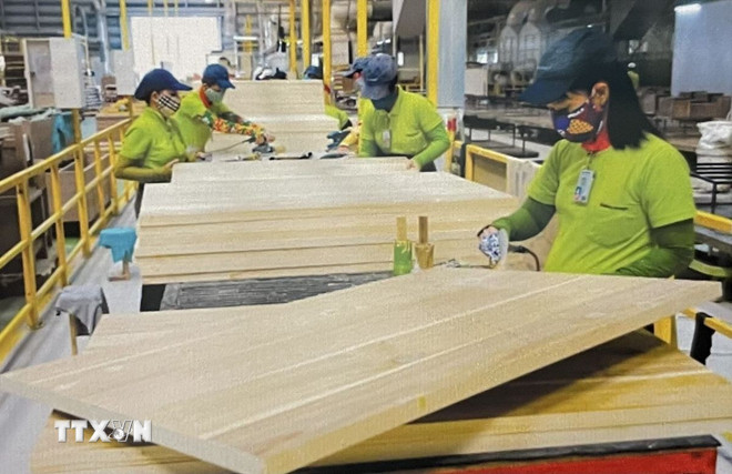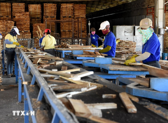 Công nhân nhà máy gỗ chuẩn bị nguồn hàng xuất khẩu. (Ảnh: Hồng Nhung/TTXVN)