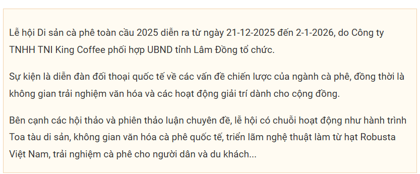 Thông tin trên được ông Nguyễn Nam Hải, Chủ tịch Hiệp hội Cà phê Ca cao Việt Nam (VICOFA), đưa ra tại Hội thảo khoa học cà phê quốc tế ngày 22-12. Hội thảo nằm trong khuôn khổ Lễ hội Di sản cà phê toàn cầu 2025, diễn ra tại Lâm Đồng từ 21-12-2025 đến 2-1-2026.